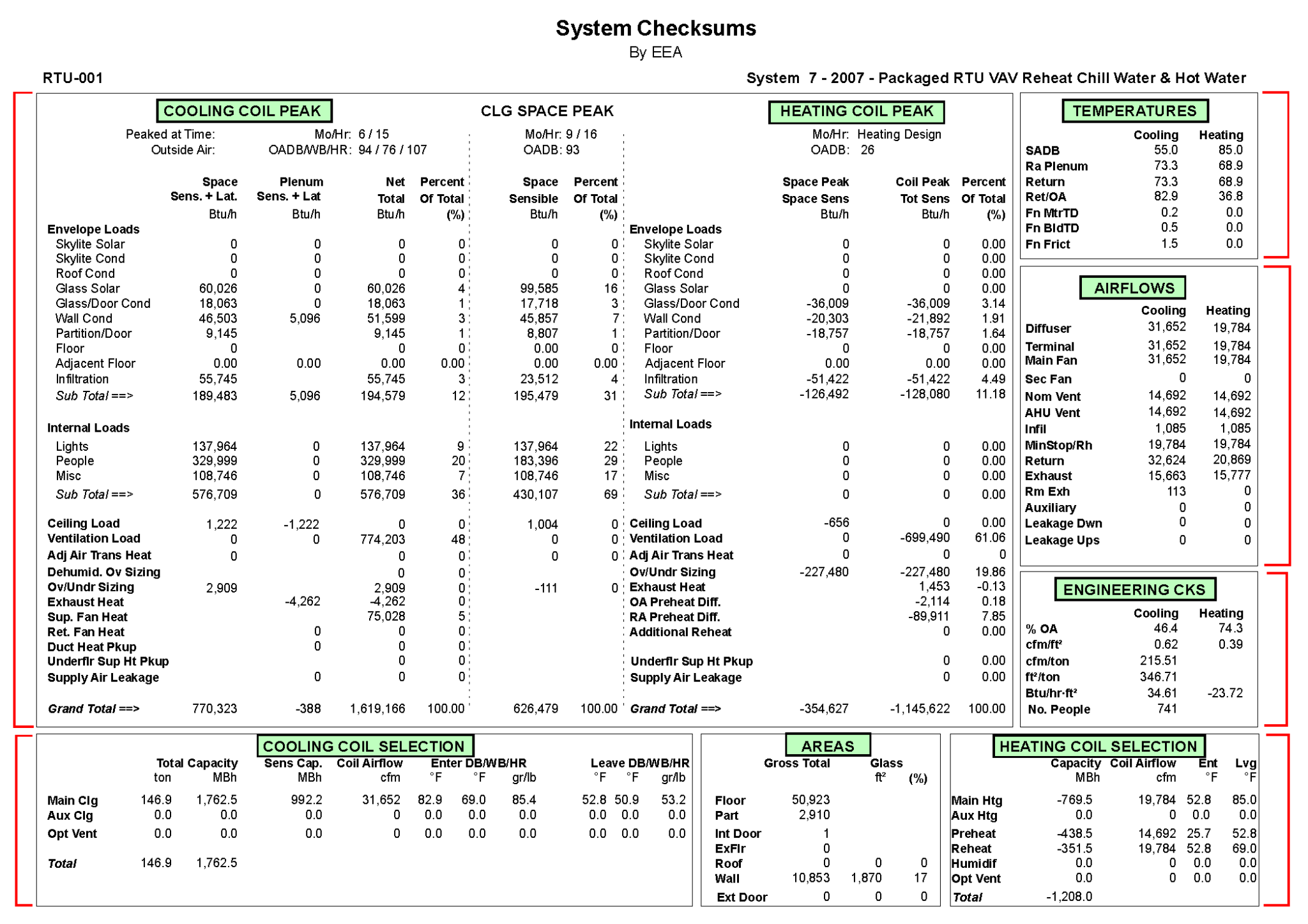 Figure 5: System Checksums report for RTU-001 — cooling coil peak, heating coil peak, airflows, temperatures, and engineering checks.
